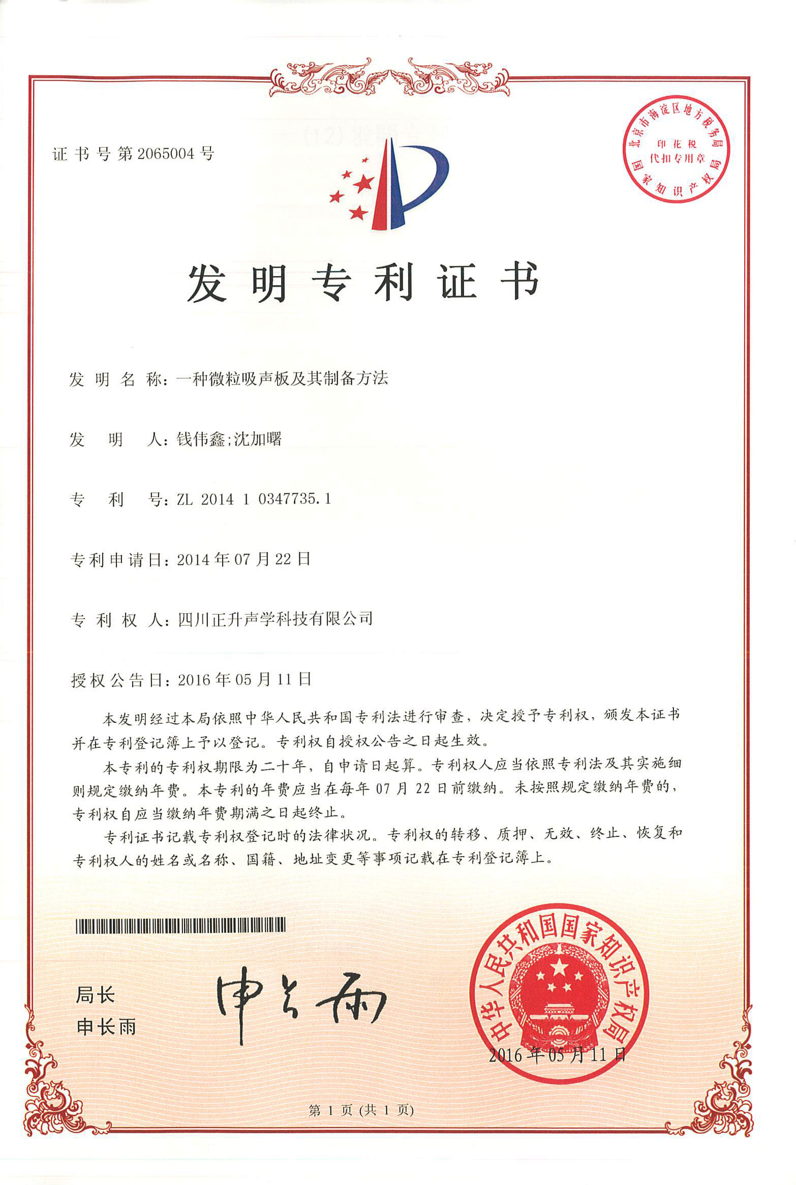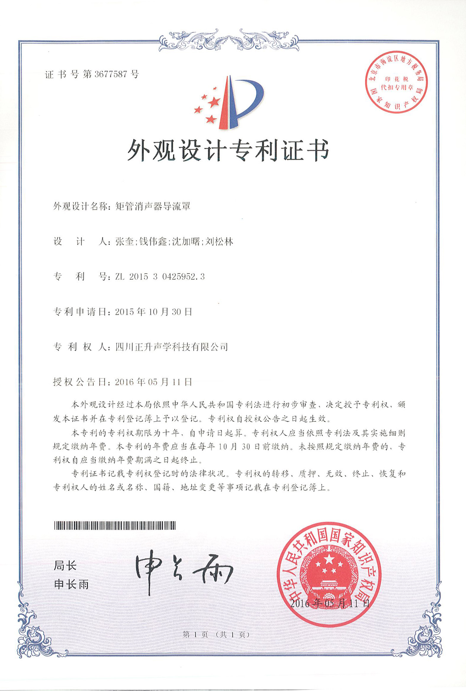 公司板式聚合微粒降噪結構、懸掛式聚合微粒吸聲模塊、矩管消聲器導流罩、一種微粒吸聲板及其制備方法、一種景觀化的聚合微粒吸隔聲聲屏障等實用新型專利授權且頒發證書