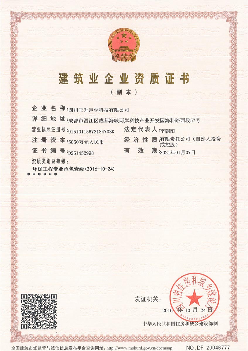 經(jīng)過正升聲學(xué)公司一年多的努力,新的資質(zhì)證書升級申請又傳來好消息。近日,經(jīng)四川省住房和城鄉(xiāng)建設(shè)廳批準(zhǔn),正式向我公司頒發(fā)了環(huán)保工程專業(yè)承包一級資質(zhì)證書。這標(biāo)志著正升公司將可承擔(dān)各類環(huán)保工程的施工項目,正升也成為同行業(yè)為數(shù)不多的取得該資質(zhì)的企業(yè)。