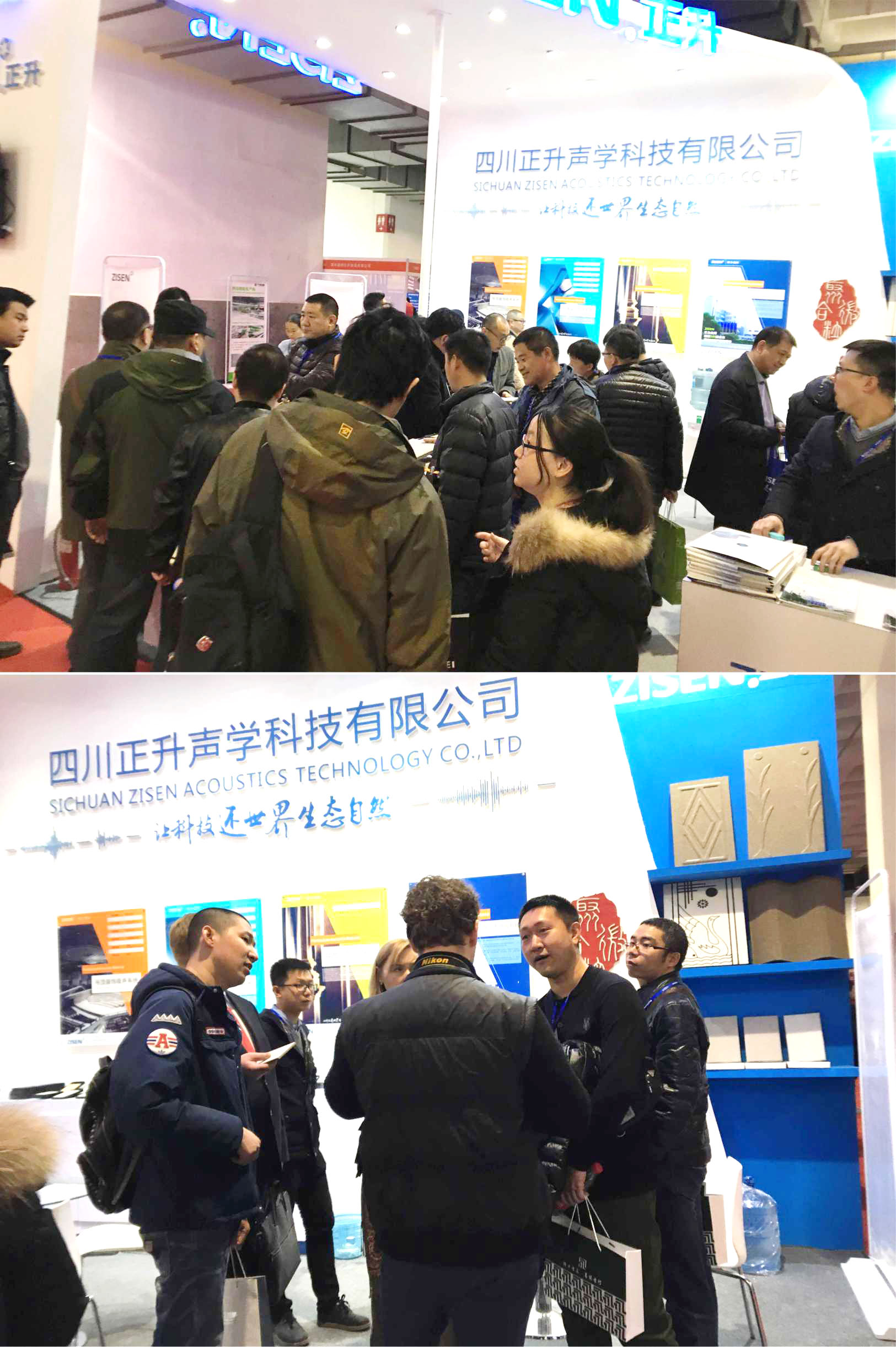根據這次展會的主題,正升聲學科技有限公司以聚合微粒藝術吸聲材料為主打產品,以創新工藝為熱點,以聚合微粒材料技術為要點,以健康環保、隔音降噪為主題進行宣傳展示。